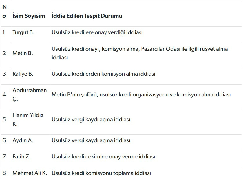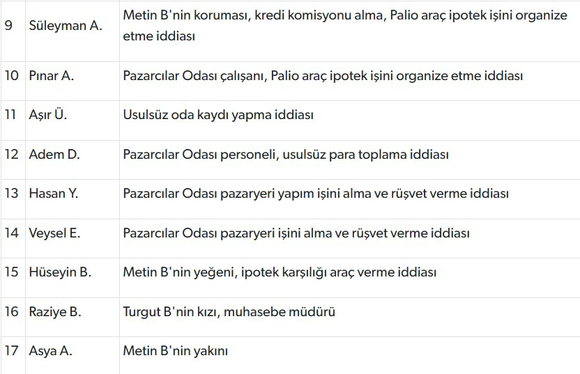 Kredi borcunu ödemeyen kişilerin ipotek gösterdiği taşınmazların üçüncü kişilere satışının sağlandığı, düşük tutarlı kredilerin kapatılmasının ardından bu taşınmazların yüksek bedellerle yeniden satıldığı tespit edildi. Pazarcılar Odası üzerinden yapılan usulsüz işlemlerle oda bütçesinden para çıkışı yapıldığı, bu paralar karşılığında şüphelilere yat, araç ve taşınmaz alındığı iddia edildi.