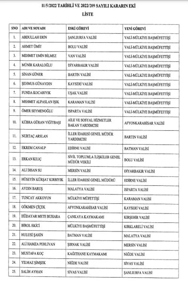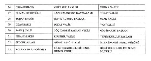 'Aile ve Sosyal Hizmetler Bakan Yardımcısı Kübra Güren Yiğitbaşı Afyon Karahisar’a, İller İdaresi Genel Müdürü Hüseyin Kürşat Kırbıyık Edirne’ye, Sivil Toplumla İlişkiler Genel Müdür Vekili Erkan Kılıç Bolu’ya, Teftiş Kurulu Başkanı Turan Ergün Uşak’a, İller İdaresi Genel Müdür Yardımcısı Nurtaç Arslan Bartın’a, Çankaya Kaymakamı Hüdayar Mete Buhara Kırşehir’e, Mülkiye Başmüfettişi Birol Ekici Kırklareli’ye, Kağıthane Kaymakamı Mustafa Koç Niğde’ye, Gaziosmanpaşa Kaymakamı Numan Hatipoğlu Tokat’a vali oldu.'