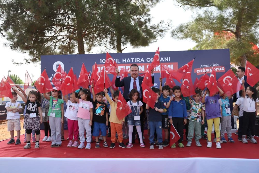 Konuşmaların ardından Başkan Böcek minik çocuklarla marşlar eşliğinde bayrak salladı. Başkan Muhittin Böcek, daha sonra minik çocuklarla birlikte zeytin ve defne fidanlarını toprakla buluşturdu.