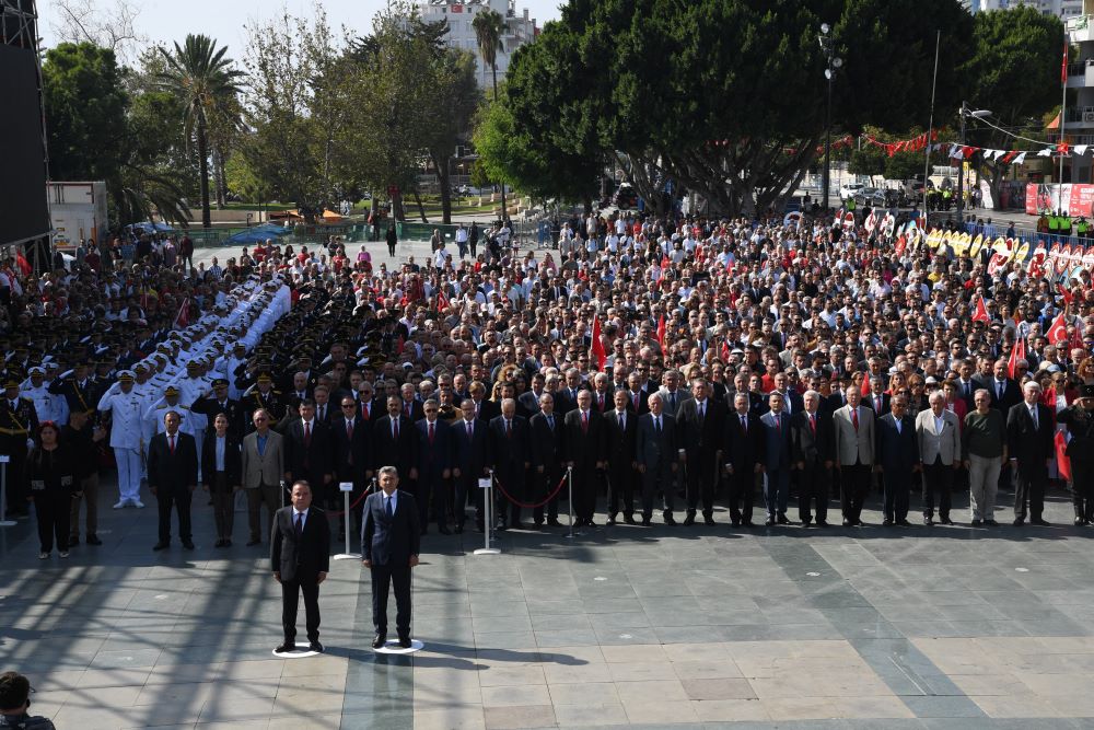 Törende Vali Şahin ve Antalya Büyükşehir Belediye Başkanı Böcek’in meydandaki Atatürk Anıtına çelenk sunmasının ardından Saygı Duruşu ve İstiklal Marşı’nın okunmasıyla sona erdi.