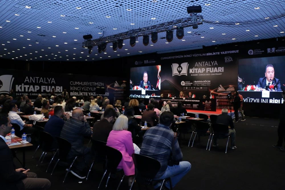 Antalya Büyükşehir Belediyesi ev sahipliğinde bu yıl 24 Kasım-3 Aralık 2023 tarihleri arasında düzenlenecek 13. Antalya Kitap Fuarı nedeniyle Antalya Büyükşehir Belediye Başkanı Muhittin Böcek, Fuar Koordinatörü Nurdan Aydın Polatçı ile birlikte basın toplantısı düzenledi. Bugüne kadar kent ve kentliler adına birçok projeye imza attıklarını söyleyen Başkan Muhittin Böcek, birbirinden kıymetli projeler arasında kitap fuarının kendisi için farklı bir anlam taşıdığını belirtti.
