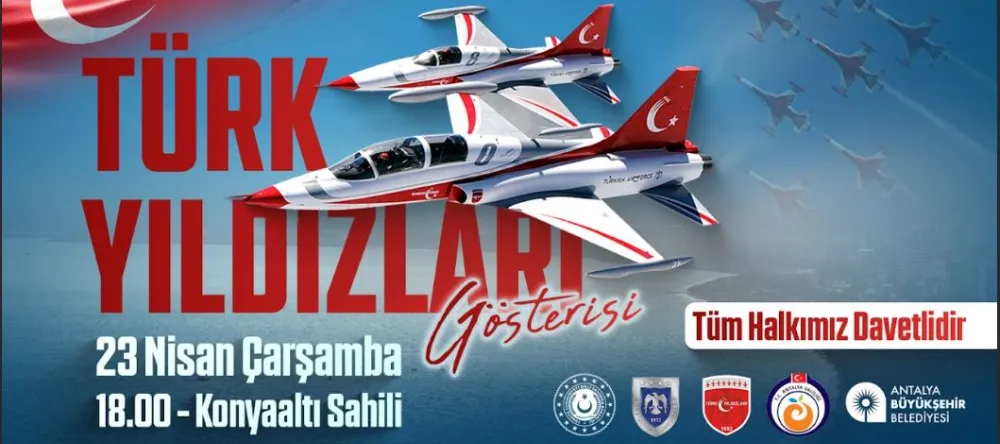 Antalya Büyükşehir Belediyesi Kültür ve Sosyal İşler Dairesi Başkanlığı tarafından hazırlanan kutlama programı kapsamında, 23 Nisan Çarşamba günü saat 18.00’de Antalya Valiliği iş birliğiyle Konyaaltı Sahili’nde Türk Yıldızları gösterisi gerçekleştirilecek. Türk Hava Kuvvetlerinin akrobasi timi Türk Yıldızlarının nefes kesecek gösterisi 23 Nisan kutlamalarına renk ve heyecan katacak.