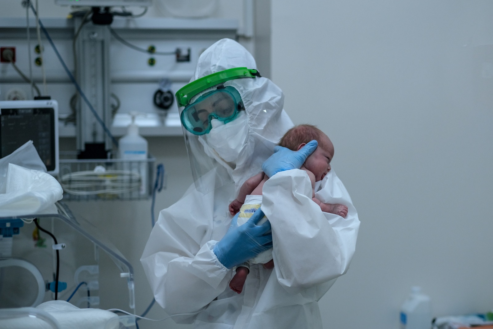 Sancaktepe Şehit Profesör Doktor İlhan Varank Eğitim ve Araştırma Hastanesi yeni doğan yoğun bakım ünitesinde görev yapan hemşire Ece Özcan, annesi koronavirüse yakalanan küçük bebeklerle ilgileniyor.