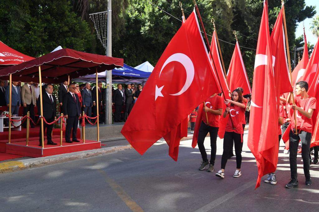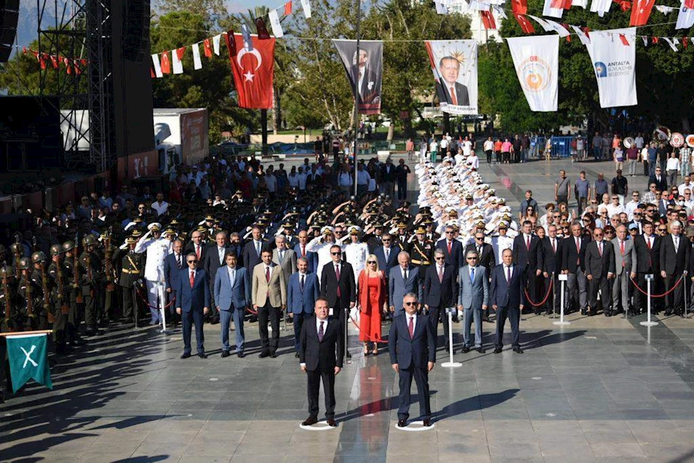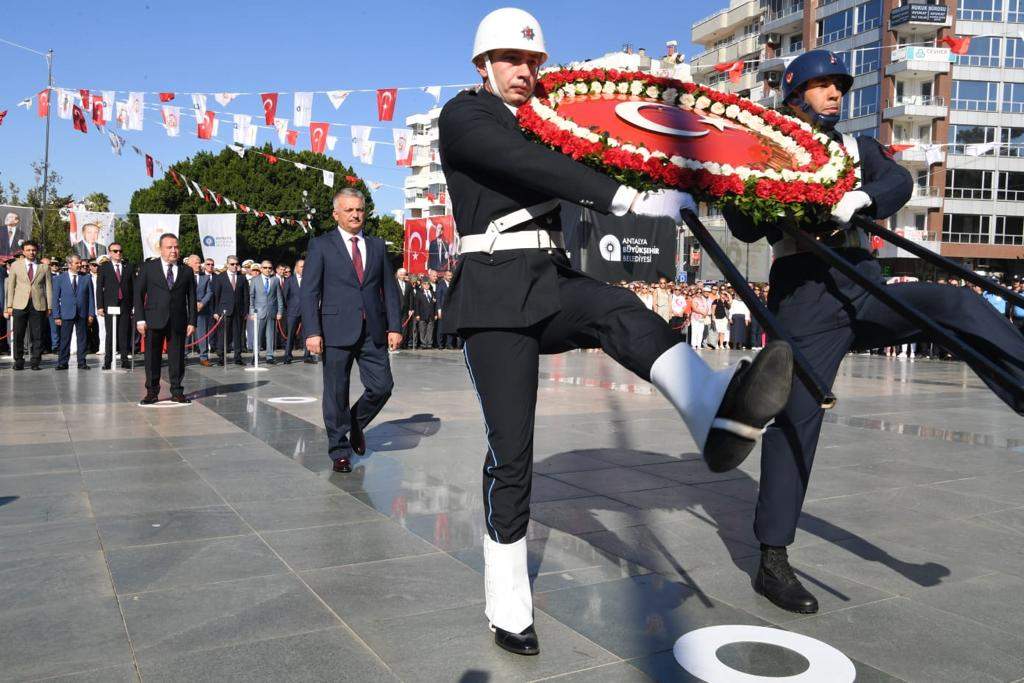 Büyük Zafer'in 100'üncü yılı kutlamaları tüm yurtta olduğu gibi Antalya’da da coşkuyla kutlandı. 30 Ağustos Zafer Bayramı’nın 100’üncü yıl dönümü kutlamalarına Vali Ersin Yazıcı’nın yanı sıra Milletvekilleri, Büyükşehir Belediye Başkanı Muhittin Böcek, Cumhuriyet Başsavcısı Zafer Koç, Akdeniz Üniversitesi Rektörü Prof.Dr. Özlenen Özkan, Vali Yardımcıları, Kaymakamlar, Kamu Kurum Müdürleri, Sivil Toplum Kuruluşu Temsilcileri ve çok sayıda vatandaş katıldı. Kutlamalar ilk olarak Vali Yazıcı ve Büyükşehir Belediye Başkanı Böcek’in Cumhuriyet Meydanı’nda bulunan Ulusal Yükseliş Anıtı’na çelenk sunmasıyla başladı. Saygı duruşu ve İstiklal Marşı’nın okunmasıyla birlikte Cumhuriyet Meydanı’ndaki etkinlik sona erdi.