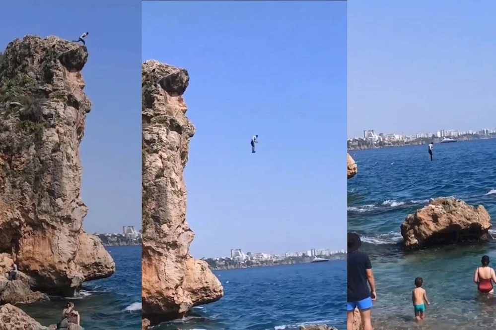 Antalya Muratpaşa ilçesi Varyant bölgesinde bulunan yaklaşık 30 metre yüksekliğindeki falezlerde bir genç canını hiçe sayarak üzerindeki elbiselerle denize atladı. Genci görenler telefona sarılırken bazıları ise bu anı telefon kamerasının ağır çekim moduyla görüntüledi. O sırada denize giren vatandaşlar olan biteni şaşkınlıkla izlerken denize atlayan genç kısa sürede suyun üzerine çıktı ancak vatandaşlardan bazıları, gencin bu ölümüne atlayışına övgü yağdırdı. /HABERLER.COM