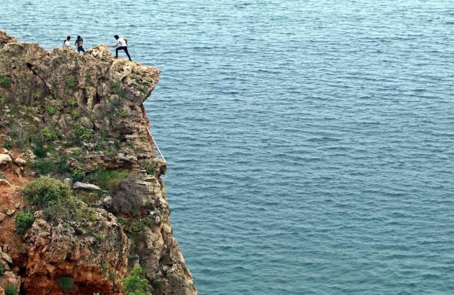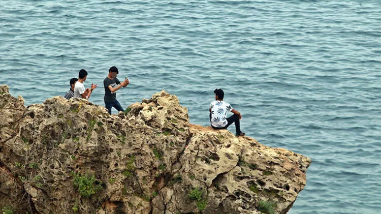 Antalya'da varyant seyir terasına yakın kısımdaki 25 metrelik falezlere gelen 4 genç, bayram yoğunluğunun yaşandığı sahili arkalarına alarak fotoğraf çekinmek için hayatlarını tehlikeye attı. İlk olarak inişin yasak olduğu bölgeden falezlere tırmanan gençler zirveye ulaştı. Burada bir süre kayalık kısımlarda şakalaşan gençler, ardından uçurum kenarına gelerek arkalarına dünyaca ünlü Konyaaltı Sahili'ni alıp birbirlerinin fotoğrafını çekti. Gençlerin tehlikeli fotoğraf çekimi görenlerin yüreğini ağzına getirdi.