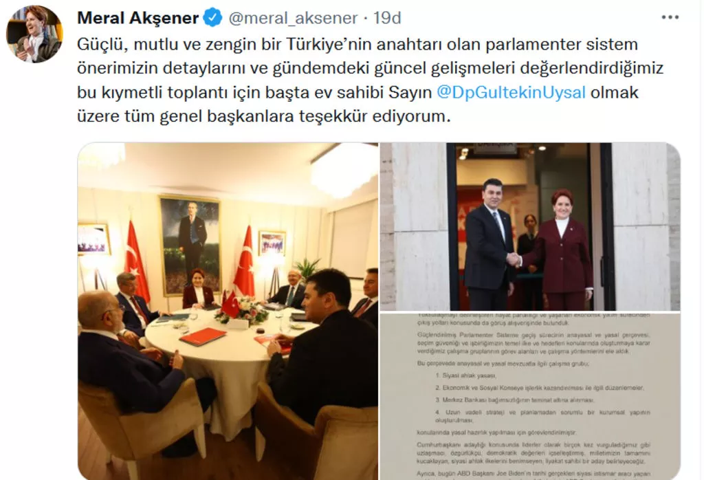 Akşener 'Güçlü, mutlu ve zengin bir Türkiye’nin anahtarı olan parlamenter sistem önerimizin detaylarını ve gündemdeki güncel gelişmeleri değerlendirdiğimiz bu kıymetli toplantı için başta ev sahibi Sayın Gültekin Uysal'a olmak üzere tüm genel başkanlara teşekkür ediyorum' dedi.