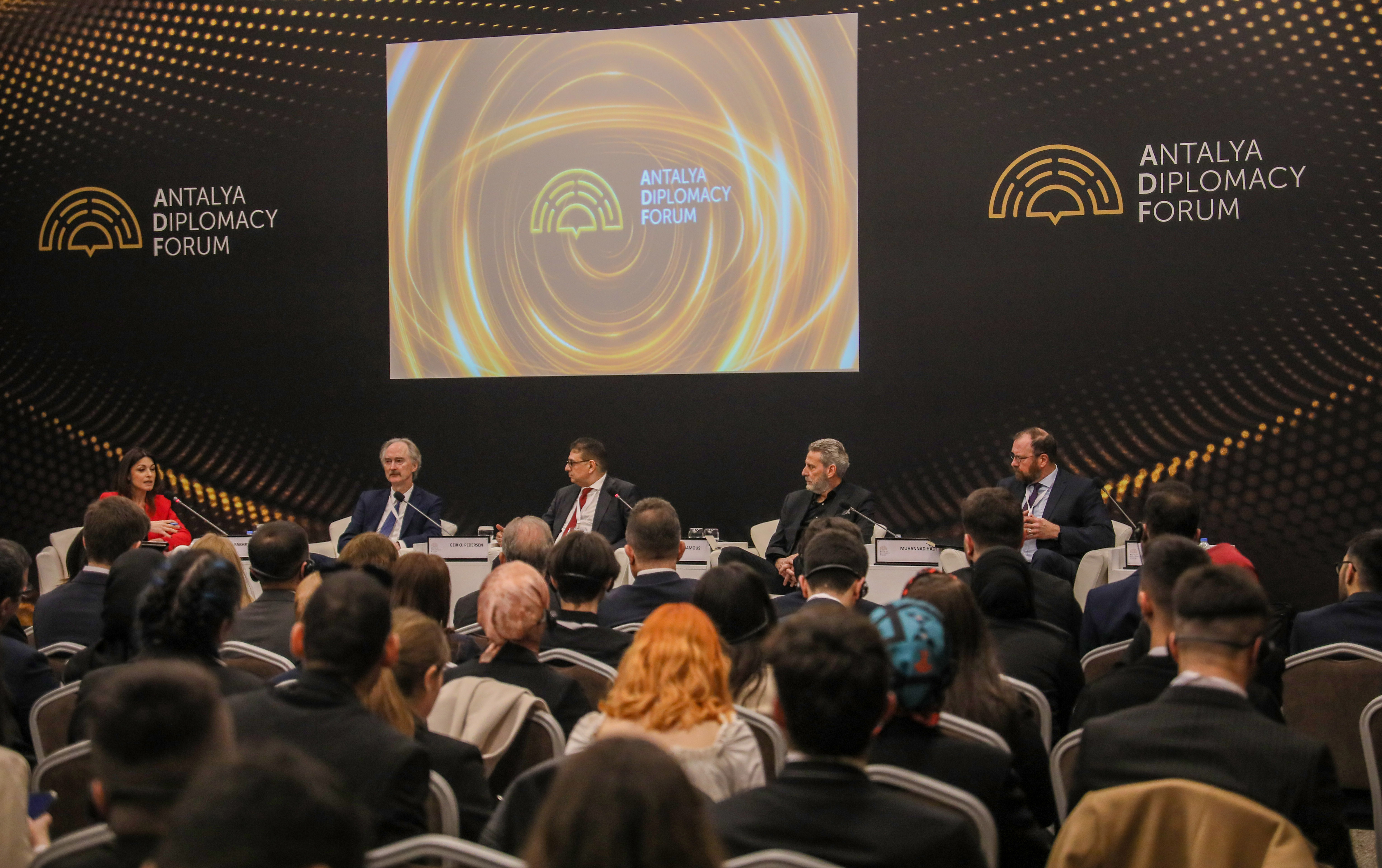 Antalya Diplomasi Forumu, 'Suriye'de İstikrara Giden Yol' paneliyle başladı. Gazeteci Ghida Fakhry'in moderatörlüğünü yaptığı panele konuşmacı olarak Birleşmiş Miletler (BM) Suriye Özel Temsilcisi Geir Pedersen, Suriye Müzakereleri Komitesi Başkanı Bader Jamous, BM Suriye Krizi Bölgesel İnsani Koordinatörü Muhannad Hadı, Avrasya İnsani Diyalog Merkezi Bölgesel Direktörü David Gorman, Araştırmacı Rich Outzen katıldı. Panelde konuşan BM Suriye Özel Temsilcisi Geir Pedersen, Suriye'de çözüm için ABD, Türkiye, Rusya ve İran'ın masaya oturmasının şart olduğunu söyledi. Pedersen, Ukrayna'da yaşanan savaşın ardından ABD ile Rusya arasındaki iletişimin kopma noktasına geldiğini, Suriye'deki krizin artmasının ise kimsenin yararına olmayacağını söyledi.