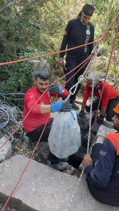 7 kişiden olan profesyonel ekip, 20 metrelik su kuyusuna halat yardımıyla indi. Ekipler, kuyu tabanında plastik, cam ve insanlara ait bazı kişisel eşyalar ile madeni para bulundu. Toplanan çöpler ekiplerce çuvallara doldurulup kuyu dışına çıkartıldı. Ekipler sarnıçlarda da temizlik çalışması gerçekleştirdi. /İHA