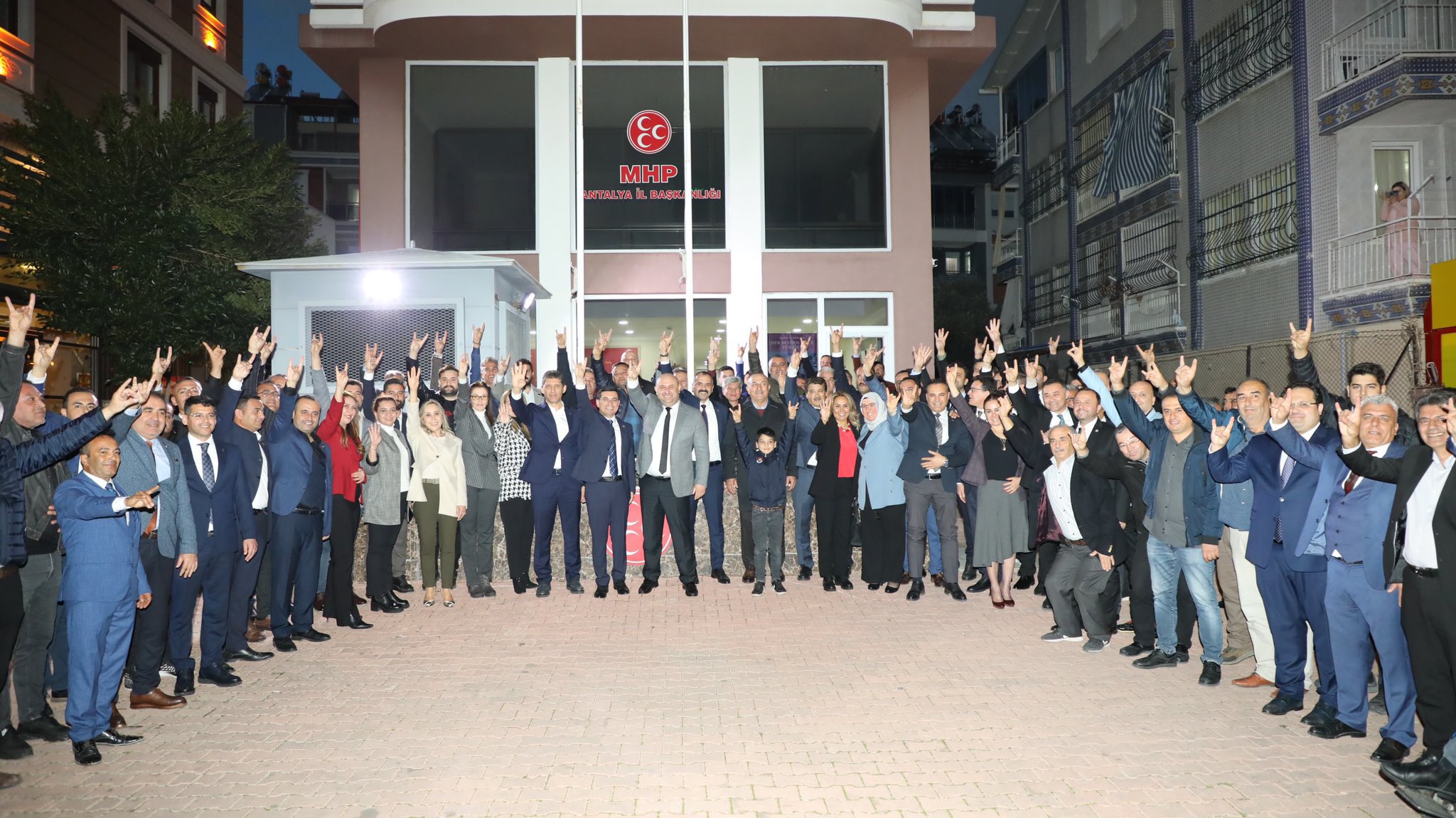 “Biriz, birlikteyiz, birlikte kazanacağız” diyen AKP’liler, ziyaret sonrası MHP il binasının önünde bir hatıra fotoğrafı çektirdiler. Cumhur İttifakı Antalya Büyükşehir Belediye Başkan adayı Hakan Tütüncü, Antalya Milletvekili Kemal Çelik ve bazı AKP’liler, MHP’lilerle birlikte bozkurt işareti yaparak objektife poz verirken, AKP İl Başkanı Ali Çetin, Antalya Milletvekilleri Tuba Vural Çokal ve Mustafa Köse ise rabia işareti yaptı.