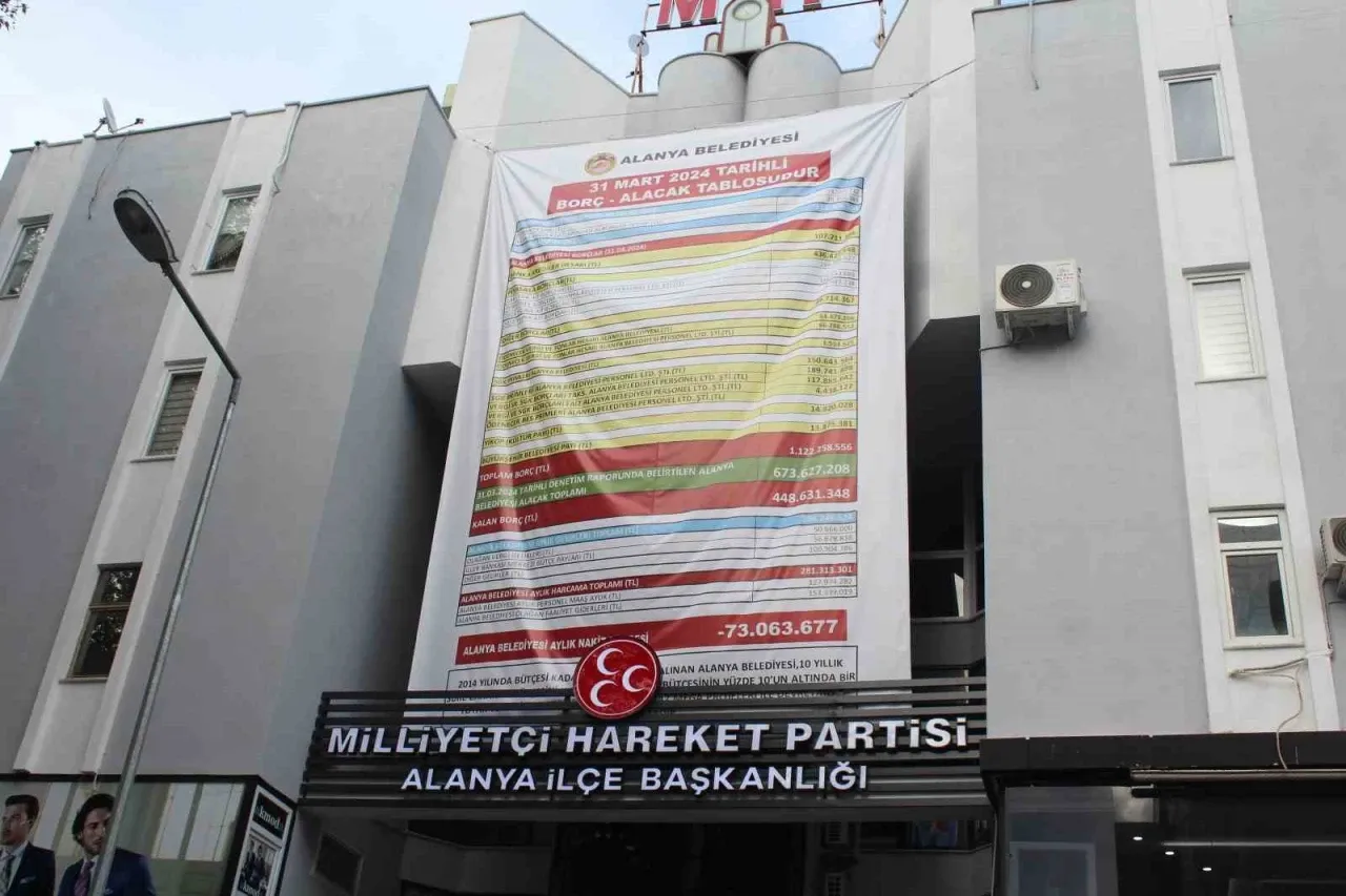 Önceki dönem Alanya Belediye Başkanı Adem Murat Yücel’in partisi MHP’nin binasına ise belediyenin borç listesinin yer aldığı başka bir aylık gelir gider denge afişi asıldı. Afişte yazılan borcun 448 milyon 631 bin 348 lira olduğu görüldü. MHP Alanya İlçe Teşkilatı’ndan konuyla ilgili yapılan açıklamada, “2014 yılında bütçesi kadar borcu ile devralınan Alanya Belediyesi, 10 yıllık süre zarfında bütçesini 40 kat büyüterek, bütçesinin yüzde 10’unun altında bir borç ile ve halihazırda silinemez, yıkılamaz mega projeleri ile devretmiş bulunmaktadır. Alacak kalemi eklenmiş Alanya Belediyesi ‘Mali Durum Göstergesi’ ektedir” ifadelerine yer verildi.