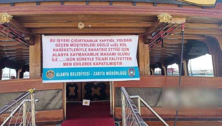 Alanya’da zabıta ekipleri yaptıkları denetimlerde hanutçuluk veya çığırtkanlık yaptığı belirlenen 5 iş yerini mühürledi. Alanya Belediyesi, çığırtkanlık ve hanutçuluk yaptığı belirlenen işyerlerine idari para cezası da uyguladı. Zabıta ekipleri, ilgili işyerlerinin hanutçuluk ve çığırtkanlıktan dolayı kapatıldığını açıklayan afişleri de işletmelerin girişine astı. Bundan sonra da hanutçuluk ve çığırtkanlıktan ceza alan işyerlerinin bu şekilde ifşa edileceği açıklandı.