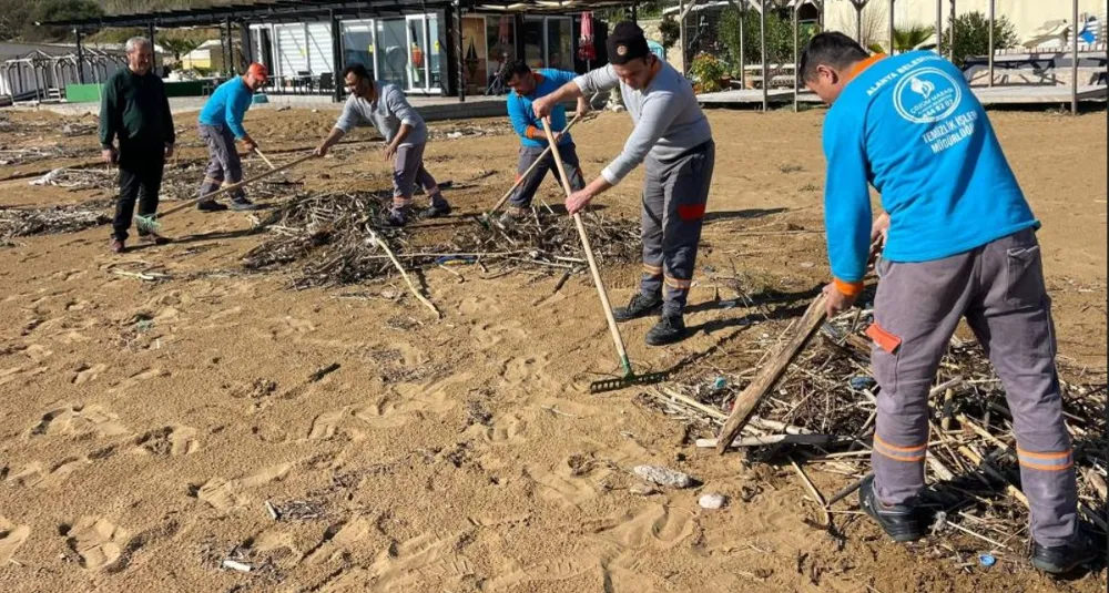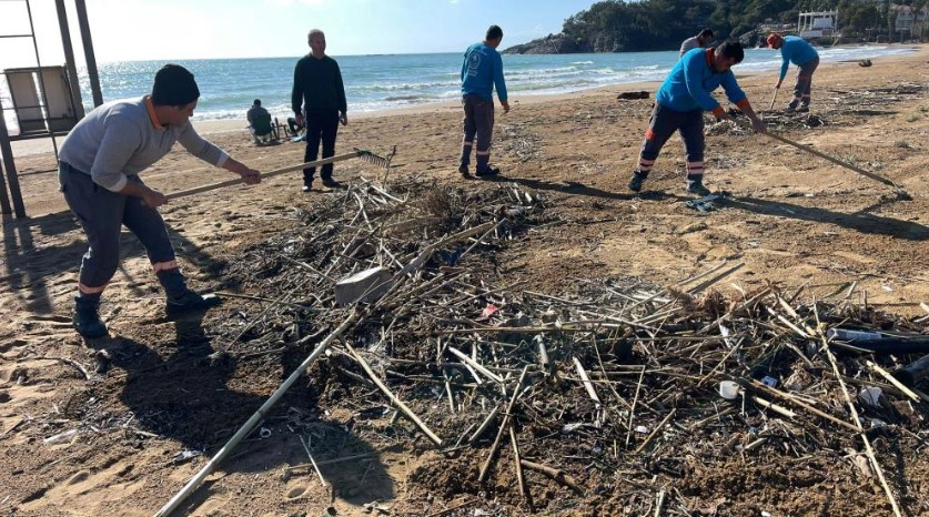 Şiddetli yağışların yaşandığı Alanya'da yağmur suları ile birlikte sahilde biriken atıklar ekipler tarafından temizlendi.