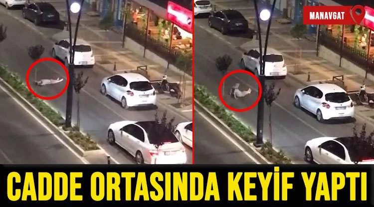 Antalya'nın Manavgat ilçesinde aşırı alkollü şahıs cadde ortasına yatarak araçların geçişine izin vermedi. Şahsın rahat tavırları ise görenlere pes dedirtti.