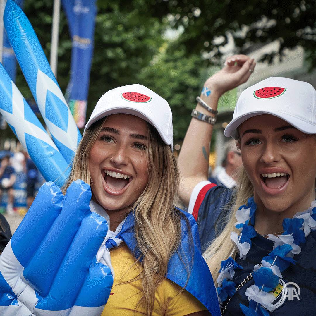 Stuttgart’taki İskoçya-Macaristan karşılaşması için gelen taraftarlara da Filistin ile özdeşleşen karpuz dilimi desenli şapkalar dağıtılarak, Gazze ile dayanışma mesajı verildi.