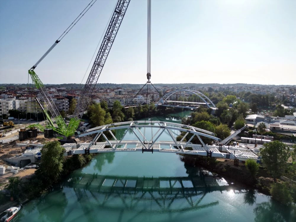 Manavgat Belediyesi tarafından kent trafiğini rahatlatmak ve ulaşımı kolay hale getirebilmek amacıyla yapımına devam edilen ve Örnek ile Eski Hisar Mahallelerini birbirine bağlayan Manavgat’ın 4’ncü taşıt köprüsünde sona gelindi. Taşıt köprüsünün ana gövdesinin yerleştirilmesine Manavgat Belediye Başkanı Şükrü Sözen ve belediyenin teknik ekipleri de eşlik etti. Başkan Şükrü Sözen, tüm çalışmaları titizlikle takip etti, sürekli olarak bilgi alışverişinde bulundu. Avrupa’nın en büyük yük taşıma kapasitesine sahip olan 1600 tonluk vinçle, ilk olarak ana gövdeler birbiriyle birleştirildi. Gövde aksamı 400 ton olan Manavgat’ın 4’ncü taşıt köprüsünün malzemeleri ise İstanbul’dan 55 adet tırla getirildi. 91 metre uzunluğu olan köprüde yol genişliği 16.5 metre olacak.