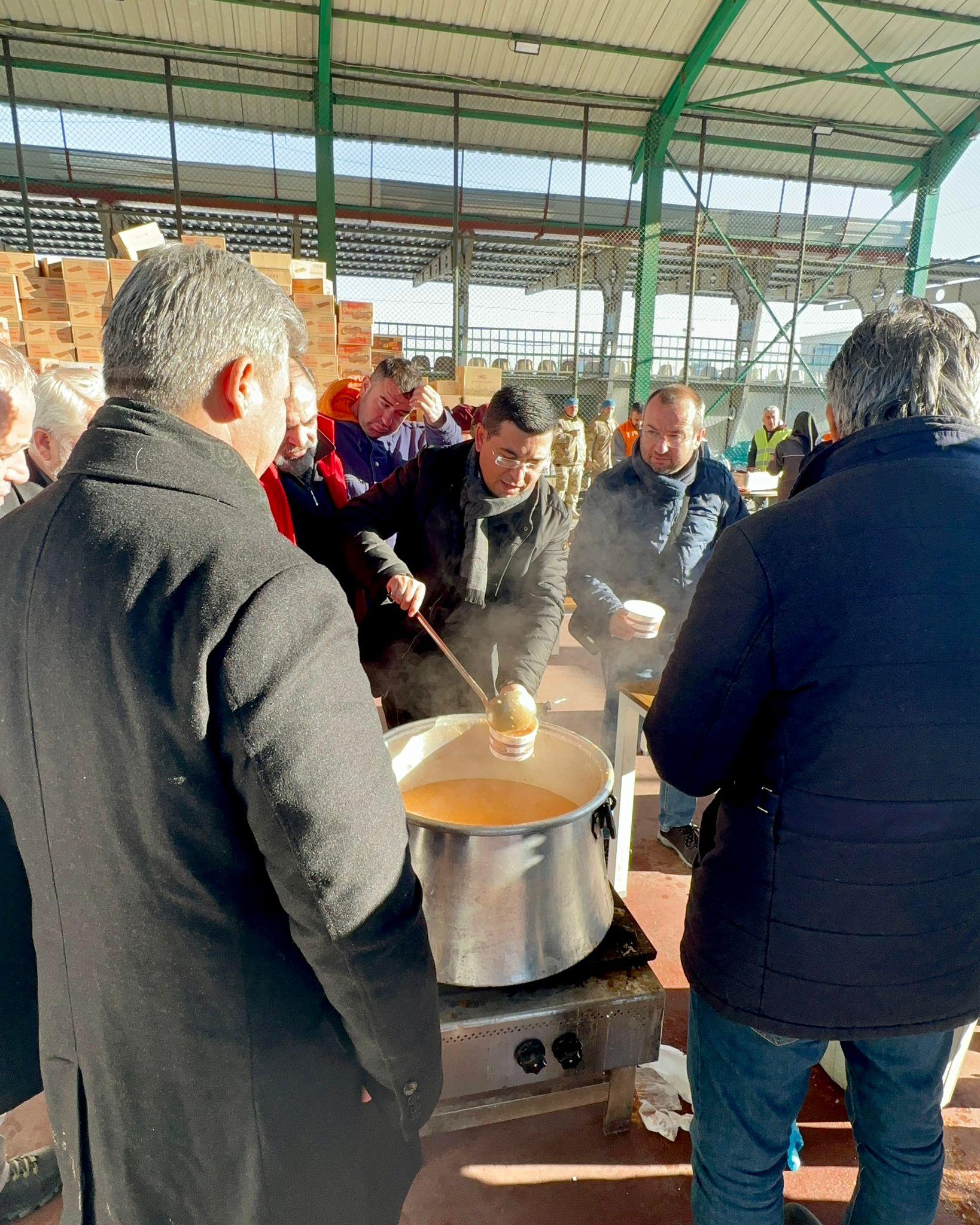 Kepez Belediye Başkanı Hakan Tütüncü, daha sonra Sahra Mutfaklarında pişirilen mercimek çorbasını depremzedelere dağıtarak, gönülleri ısıttı.
