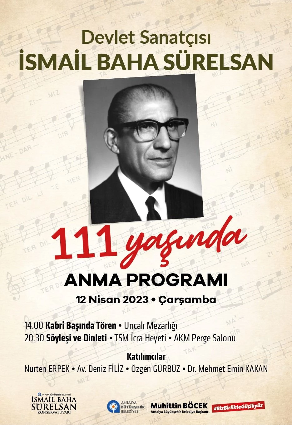 Antalya Büyükşehir Belediyesi Kültür ve Sosyal İşler Dairesi Başkanlığı Devlet Sanatçısı İsmail Baha Sürelsan için vefatının 25. yılında anma programı düzenledi. Anma programı 12 Nisan Çarşamba saat 14.00’te Sürelsan’ın Uncalı Mezarlığı’ndaki kabri başında yapılacak tören ile başlayacak. Program saat 20.30’da Atatürk Kültür Merkezi Perge Salonu’ndaki söyleşi ve dinleti ile devam edecek.