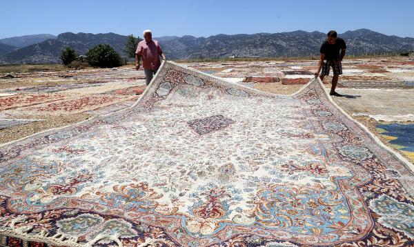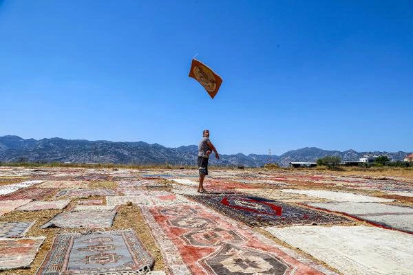 Turizm kenti Antalya'nın Döşemealtı ilçesinde kışın buğday ekilen tarlalar, yazın kavurucu sıcaklarda halı tarlasına dönüşüyor. Farklı renk ve desenlerde dokunan yün halılar, yüzlerce dönüm araziye serilip günlerce güneşte bekletiliyor. Nem nedeniyle içerilerinde biriken ve zarar veren bakteri ve böceklerden arındırılan halıların renkleri de güneşle birlikte daha pastel tonlara kavuşuyor. Döşemealtı ilçesinde yıllardır halı alım ve satışının yanı sıra onarımını da yapan Halil Börekçi, bu yıl buğday hasadının ardından 25 dönümlük tarlasına 2 bine yakın halı serdi. Çalışanlar, sabah erken saatlerde halıları tarlaya serip, gölgelik alanlarda onarılması gerekenleri onarıyor. Öğleden sonra da halıların diğer yönleri çevrilip akşama kadar güneşlendiriliyor. Bu işlem günlerce sürüyor. Halıların tamamının yün dokuma olduğunu belirten Halil Börekçi, İç Anadolu ve Karadeniz bölgesinden dahi güneşte bekletilmesi için gönderilen halılar olduğunu söyledi. Halılar arasında nadir bulunan ve yüksek fiyatlardan satılanlar da var.