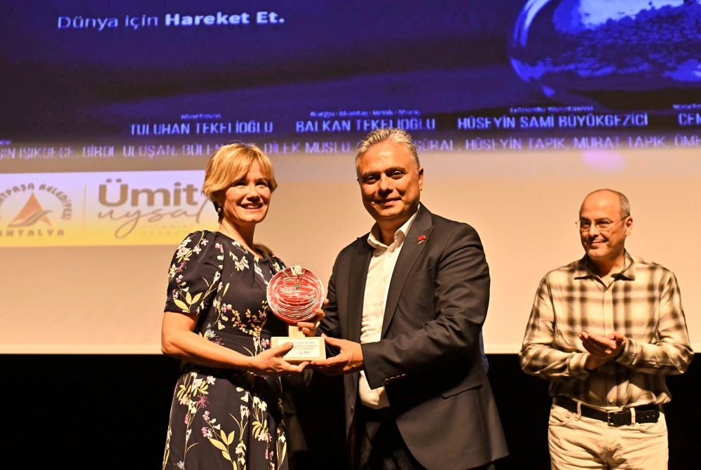 Gecenin sonunda Başkan Uysal, bu yıl çalıştayın sembolü olan koruma altındaki kum zambağının geri dönüşüm malzemeleri kullanılarak yapılan plaketini Tekelioğlu’na takdim etti.
