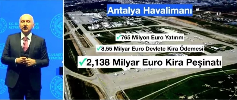Ulaştırma ve Altyapı Bakanı Karaismailoğlu, Antalya Havalimanı'nın 25 yıllık kira bedelinin yüzde 25'lik peşinatı olan 2 milyar 138 milyon Euro'nun ödemesinin gerçekleştirildiğini duyurdu.Ulaştırma ve Altyapı Bakanı Adil Karaismailoğlu dün Twitter'dan 'Geleceğin projeleri şimdiden kazandırıyor' ifadesinde bulunmuştu. Bakan Karaismailoğlu'nun bugün detayları açıkladı. Antalya Havalimanı 25 yıllık kira bedelinin yüzde 25'lik peşinatının ödenmesi töreni yapıldı. Toplamda 2 milyar 138 milyon Euro ödeme gerçekleştirildi. Toplam rakam ise 8,55 milyar Euro. Karaismailoğlu, 'Bu para ile bugün iki tane boğaz köprüsü yapılabiliyor' ifadelerini kullandı.Bakan Karaismailoğlu'nun açıklamalarından satır başları:2023'E KADAR BÜTÜN PLANLARIMIZI YAPTIKBakanlık olarak biz insan, yük ve veri hareketliliğini sağlamak amacımız. Odaklandığımız temel konular lojistik ve mobilite. 2053'e kadar bütün planlamalarımızı yaptık. 189 milyar euroluk yatırım hacmimizi planladık. 5-10 yıl sonra 2053'e kadar dağılım ortada. Demiryolu sektöründe ve haberleşmede ağırlıklı yatırımlara devam edeceğiz. Büyük bütçeli yatırımları yaparken, kamu hizmeti alması gereken projeleri de yapmamız gerekiyor. DEVLETTEN BİR KURUŞ PARA ÇIKMIYORBizim bütçemizle yapacaklarımızın aradaki farkı yap işlet devretle ülkemizin altyapısına destek sağlıyorum. Finans yönetimi var. Tasarım, yapım, işletme, bakım-onarım ve yenileme şeklinde işliyor. Yaklaşık maliyet hesaplayıp ihaleye teklif veriyorlar. Biz de en uygun teklif hangisiyle kabul ederek sözleşme imzalıyoruz. Yapım maliyeti sürecinde devletten bir kuruş çıkmıyor. Geçiş kazançları sağlamıyorsa eksiği biz karşılıyoruz. Geçtiği anda ise ilave gelir olarak para alıyoruz. AVRASYA TÜNELİ DEVLETE 10 MİLYAR LİRA KATKI SAĞLADIAvrasya Tüneli en başarılı örneklerden biri. Devlet kendisi yapsaydı 1.245 milyar dolarlık bütçeyi cebinden çıkarıp 519 milyon lira işletmeye her yıl para harcayacaktı. Avrasya Tüneli açılışından bu yana 80 milyon araç kullandı Türkiye'ye 5 yılda 10 milyar lira katkı sağladı. Yatırım sırasında bir kuruş harcamadık. 2027'de 95 bin geçiş rakamlarına çıkıyor. Covid olmasaydı 233 milyon Dolar direkt katkı sağlayacaktı. 139 milyon dolarlık bir katkı sağlayacak Covid 19'lu haliyle. 8,5 SAATLİK YOL 3,5 SAATE DÜŞTÜOsmangazi Köprüsü 8,5 saatlik yolculuklar 3,5 saate düştü. Bu otoyol sayesinde 80 km'lere çıktı seyahat hızı. Bu yol yapıldı ve ekonomiye katkısı söz konusu. 306 tesis sayısında artış oldu. 300 bin dekar ekili alanlarda artış sağlandı. Küçükbaş ve büyükbaş hayvanlarda artış oldu. 8 OSB kuruldu. 2,635 hektar genişleme sağlandı.84 MİLYONUN KULLANMASI TABİKİ MÜMKÜN DEĞİLDevletin tüm işleri Hazine garantilidir. Bunlar kamunun kullandığı işler, yatırımcı bu ülkeye yatırım yapıyor. Bu ülkenin kaynağı oluyor. Devletin projeleri devlet garanti edecek. Geçmediğimiz yola neden para diyoruz diyorlar. O zaman Adıyaman Havalimanını kullanmıyorsunuz diye yapmayacak mıydık, Kömürhan Köprüsü'nü kullanmıyorsunuz diye yapmayacak mıydık... 84 milyonun kullanması tabii mümkün değil. BAKANLIĞIMIZA İŞ YAPAN 1200 METEAHHİT VAR5'li çete o kadar yanlış ki... Dedikodu siyaseti. Projelerimizde çalışan 40'a yakın firma var. Bakanlığımıza iş yapan 1200 müteahhit var. Dünyanın her yerinde tercih edilen firmalar var. 5 değil, 40'a yakındır. Bakanlığımıza iş yapan 1200 müteahhit var. 24 firma dosya alıyor 10'u teklif veriyor. Yandaş müteahhit söylemi de yalan. /HABER7