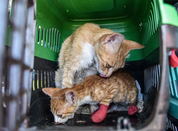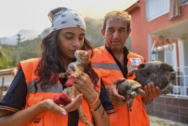 Yaralı hayvanlara yardım eden Pati Koruyucuları Derneği'nin 18 üyesi, Çanakkale, Manisa, Hatay ve Antalya'daki yangın bölgelerinde arama-kurtarma çalışması yaptı. Dernek üyeleri, Antalya'nın Kemer ilçesindeki orman yangınının 3'üncü gününde alevlerin söndürüldüğü alanda arama kurtarma faaliyeti yürüttü. Söndürülen alanları gezerek yaralı hayvanları bulup, tedavi eden dernek üyeleri, Manisa'da kurtardıkları yavru kedi ve kaplumbağaların da bakımını yapıyor. Tıbbi malzeme ve kafeslerin bulunduğu kliniğe dönüştürülen araçta kurtardıkları hayvanları tedavi eden dernek üyeleri, bıyıkları ve patisinin bir bölümü yanan yavru kedi ile annesine özenle bakıyor.