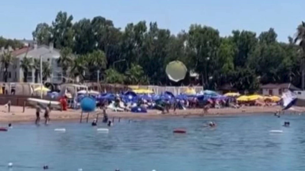 Antalya'nın ünlü plajlarından Lara Sahili'nde çıkan şiddetli rüzgar nedeniyle plajdaki şemsiyeler havada uçuştu. Şans eseri yaralanan olmadı.