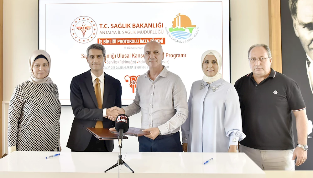 İnsan sağlığı açısından hayati öneme sahip olan protokolün imza töreni, Antalya Organize Sanayi Bölge Müdürlüğü İdari Hizmet Binasında gerçekleşti. Antalya Organize Sanayi Bölgesi Başkanı Ali Bahar ve Antalya İl Sağlık Müdürü Op. Dr. İsmail Başıbüyük ev sahipliğinde düzenlenen törende Halk Sağlığı Hizmetleri Başkanı Dr. Hacer Nur Yüce, Döşemealtı İlçe Sağlık Müdürü Dr. Duygu Türk, Antalya OSB Bölge Müdürü İlhan Metin’de hazır bulundu. Bahar ve Başıbüyük tarafından akdedilen protokol ile Döşemealtı İlçe Sağlık Müdürlüğü ekipleri, bölgedeki fabrikalar ile iletişime geçip, kanser taraması için randevu oluşturacak. Firma yetkilerinin talep ettiği gün ve saatte mobil kanser tarama aracı ile fabrika bahçesine konuşlanacak ekipler, 40-69 yaş arası kadınlara meme kanseri, 30-65 yaş arası kadınlara rahimağzı kanseri, 50-70 yaş arasındaki kadın ve erkeklere de bağırsak kanseri taraması yapacak.