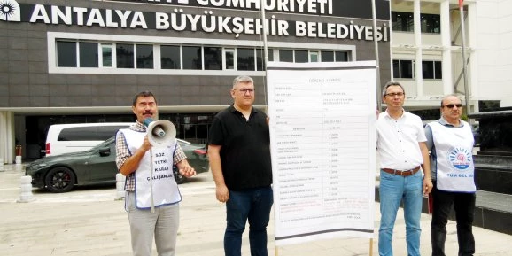 Tüm Bel-Sen Antalya Şubesi Başkanı İlhan Karakurt belediye binası önünda temsili karneyi gösterirken konu hakkında kamuoyuna bilgi verdi. Karakurt şunları söyledi: