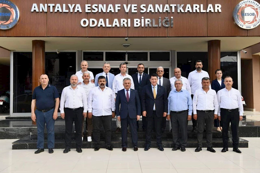 Antalya Valisi Ersin Yazıcı, yeniden Antalya Esnaf ve Sanatkârlar Odaları Birliği (AESOB) Başkanı seçilen Adlıhan Dere’yi ve yeni Yönetim Kurulu Üyelerini ziyaret edip görevlerinde başarılar diledi. Antalya’yı el birliğiyle daha güzel günlere taşıyacaklarının altını çizen Vali Yazıcı; “Şunu çok iyi biliyoruz. Esnaf kalkınırsa ülke kalkınır. Esnafımızın daima yanında ve destekçisiyiz.” dedi.