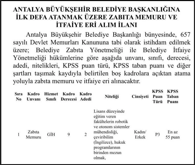 Antalya Büyükşehir Belediyesi tarafından alınacak olan zabıta için istenen şartlar şaşkınlık yarattı. İlanda işe alınacak zabıta memurunun robotik ve otonom sistemler mühendisliği mezunu olma şartı arandı.