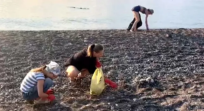 Antalya'nın önemli turizm merkezlerinden Çıralı'da, biri çocuk, 3 Rus turist, sahile bırakılan izmarit ve çöpleri temizledi.