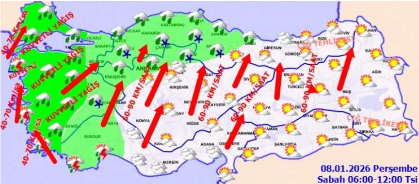 Rüzgarın, Marmara, Ege, Batı Akdeniz, İç Anadolu, Karadeniz ve Doğu Anadolu'nun batısında güneyli yönlerden kuvvetli, yer yer fırtına (60-90 km/sa) şeklinde esmesi bekleniyor. Sabah ve gece saatlerinde iç ve doğu bölgelerde buzlanma ve don olayı görüleceği tahmin ediliyor. Doğu Karadeniz’in iç kesimlerinin yüksekleri ile Doğu Anadolu’nun doğusunda yüksek kar örtüsüne sahip eğimli kesimlerinde çığ tehlikesi bulunmaktadır.