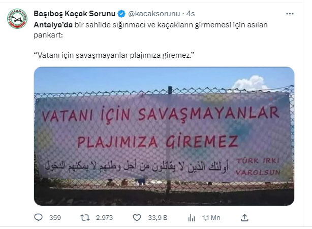 Antalya’da bir plaja sığınmacı ve kaçakların girmemesi için asılan pankart diye verilen fotoğrafta, Türkçe ve Arapça 'Vatanı için savaşmayanlar plajımıza giremez. Türk ırkı var olsun' yazıyor.