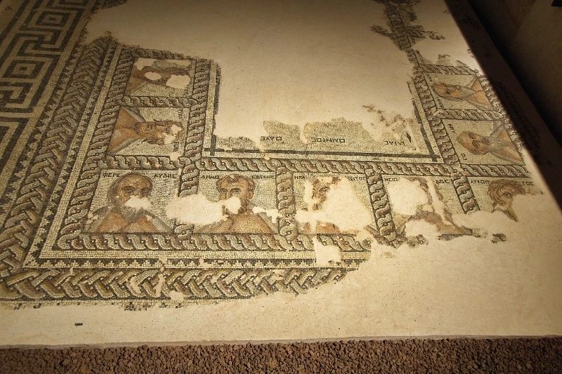 Orta bölümü büyük hasar gören yaklaşık 15 m² genişliğindeki Filozoflar Mozaiği’nin çevresindeki bordürde, dönemin ünlü filozofları, şairleri, yazarları, hatipleri ve matematikçilerinin betimlemeleri yer alıyor. Mozaikte yer alan figürler arasında; Solon, Thucydides, Lycurgos, Herodotos, Hesiodos ve Demosthenes’in portreleri bulunurken mozaiğin tam ortasında ise Homeros’un ismi geçiyor.