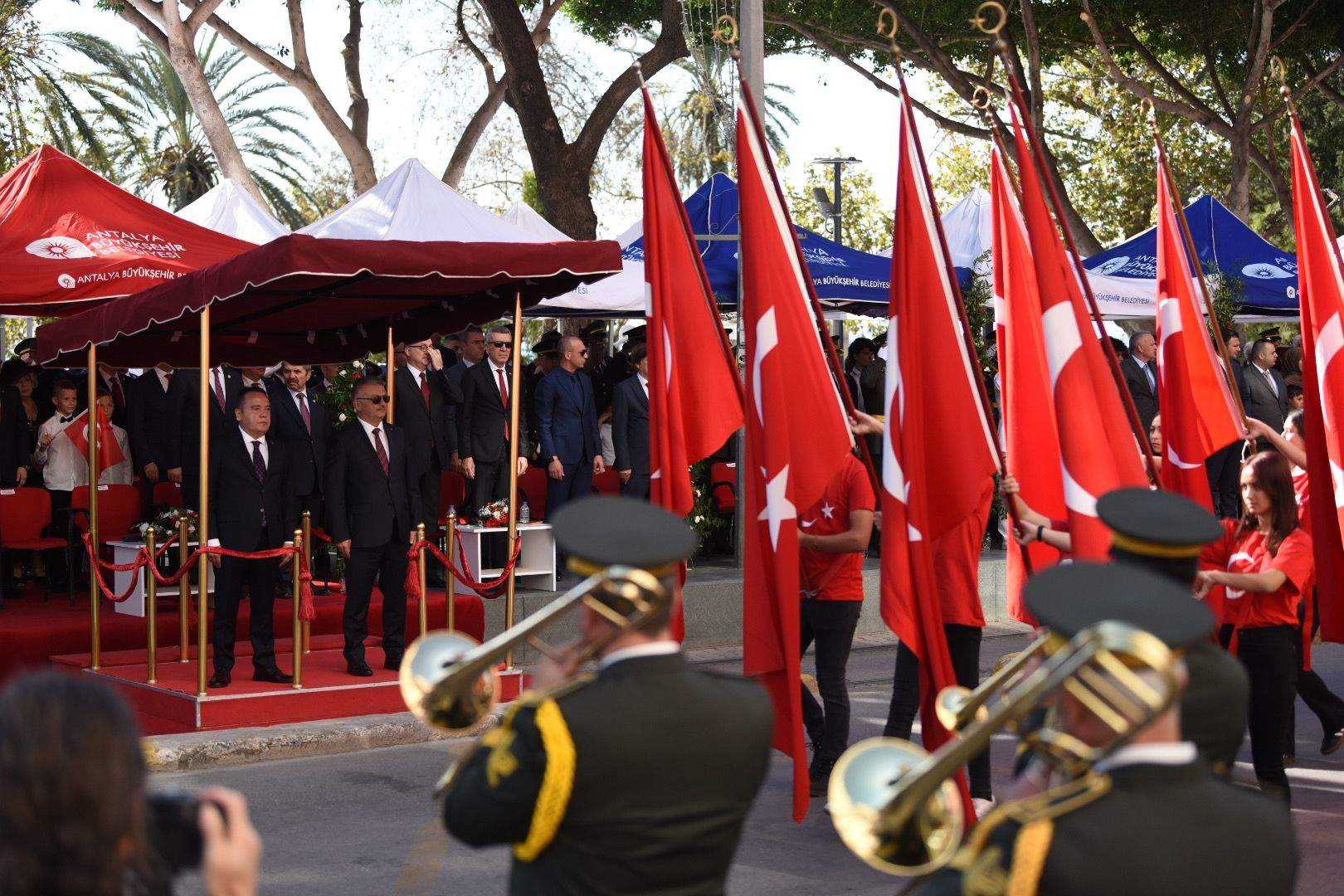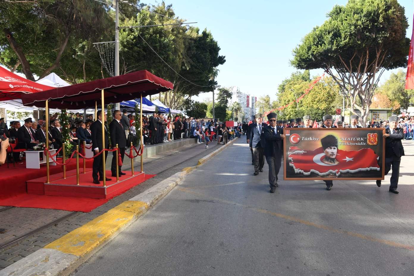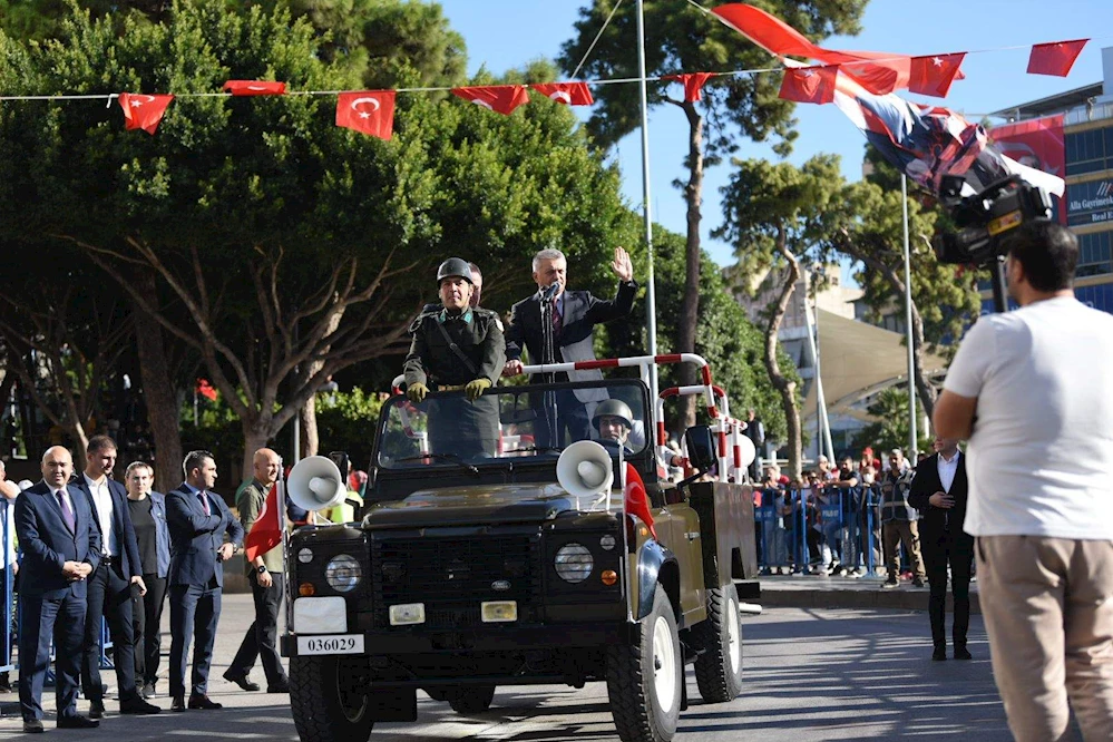 Antalyalıların, genciyle yaşlısıyla, 7’den 70’e yoğun katılım gösterdiği tören saygı duruşu ve İstiklal Marşı okunmasıyla başladı. Törende daha sonra Cumhurbaşkanı Recep Tayyip Erdoğan’ın 29 Ekim Cumhuriyet Bayramı ve Türkiye Cumhuriyeti'nin kuruluşunun 99'uncu yıl dönümü münasebetiyle yayınladığı mesajı okundu.