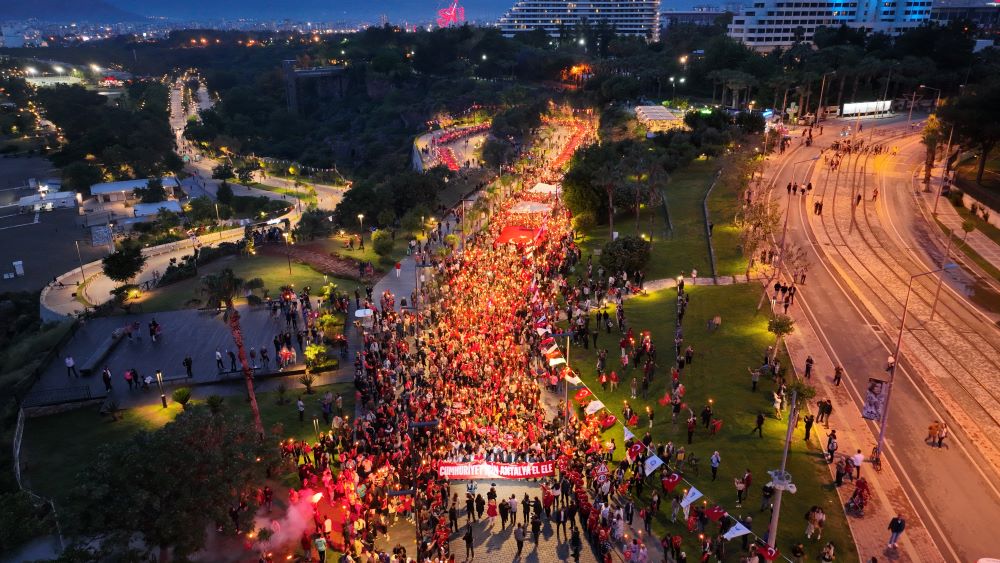 Antalya Büyükşehir Belediyesi, Gazi Mustafa Kemal Atatürk'ün Samsun'a ayak basarak Kurtuluş Savaşı'nı başlattığı gün olan 19 Mayıs 1919'un 104'üncü yıldönümü, 19 Mayıs Atatürk'ü Anma, Gençlik ve Spor Bayramı'nı büyük bir coşkuyla kutladı. Antalya genelinde tüm gün süren etkinlikler akşam da devam etti. Büyükşehir Belediyesi ve Cumhuriyet İçin Antalya El Ele Platformu tarafından Konyaaltı Varyant’tan başlayan fener alayı düzenlendi. Fener alayına katılan on binlerce Antalyalı, dev Türk bayrağı ve Atatürk posteri taşıyıp meşaleler eşliğinde yürüdü. Fener alayına Antalya Büyükşehir Belediye Başkanı Muhittin Böcek, CHP İl Başkanı Nuri Cengiz, CHP Antalya milletvekilleri, ilçe belediye başkanları, meclis üyeleri, kadın kolları, gençlik kolları, STK'lar ve on binlerce vatandaş katıldı. Katılımcılar grubun önünde bulunan Antalya Büyükşehir Belediyesi Bandosu’nun çaldığı marşlara eşlik ederek Konyaaltı Caddesi’ni takip ederek Cumhuriyet Meydanı’na ulaştı. Ellerinde fenerlerle Cumhuriyet Meydanı'na yürüyen binlerce Antalyalı, saygı duruşunda bulunarak, İstiklal Marşı’nı büyük bir coşkuyla okudu. Cumhuriyet Meydanı’nı hınca hınç dolduran on binlerce vatandaş, Antalya Büyükşehir Belediyesi Gençlik Meclisi Başkanı Ozan Şükrü Kayapınar eşliğinde hep bir ağızdan Atatürk'ün Gençliğe Hitabesi’ni okudu.