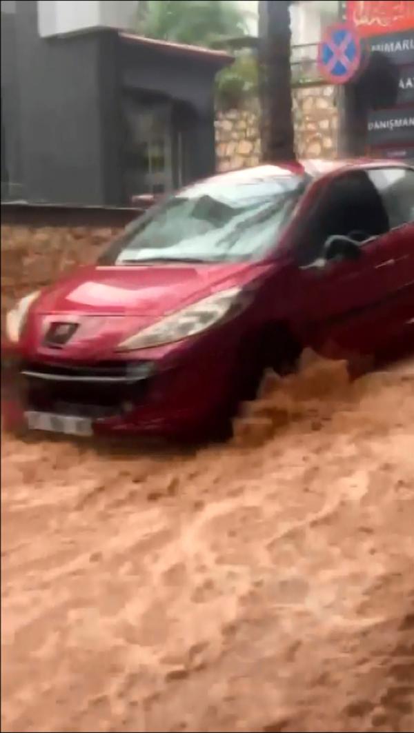 Antalya'nın Kaş ilçesinde şiddetli yağmur etkili oldu. Sokak ve caddeler su altında kaldı, Kaputaş Plajı'nda denizin rengi kahverengiye döndü. Kumluca ilçesinin önemli turizm merkezlerinden Adrasan Mahallesi'ne fındık büyüklüğünde dolu yağdı.