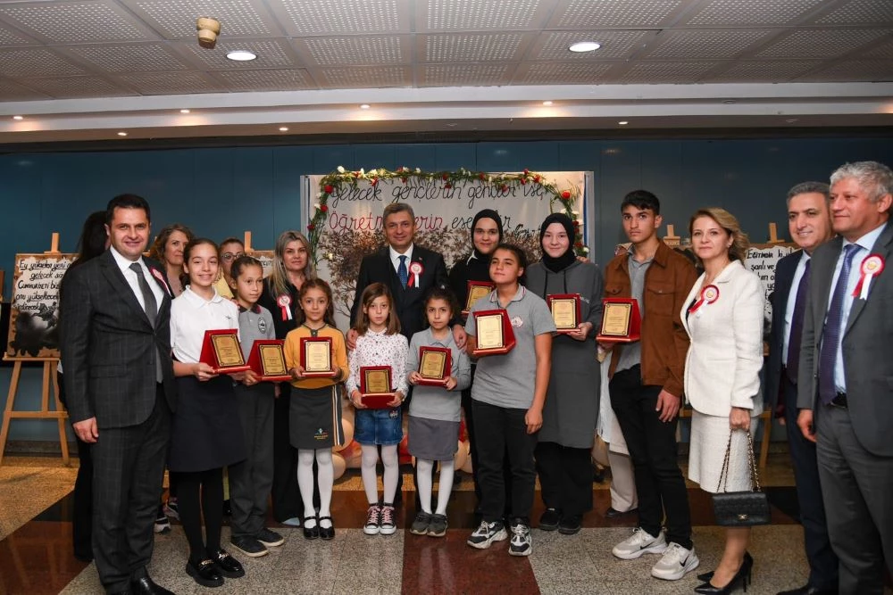 Programda Vali Hulusi Şahin, Öğretmenler Günü münasebetiyle düzenlenen yarışmada; resim kategorisinde birinci olan Ecenaz Ertekin, kompozisyon kategorisinde birinci olan İrem Cengiz ve şiir kategorisinde birinci olan Duru Erbay’a ödüllerini, hayatını eğitime adamış emekli öğretmenler Nesrin Var, Muzaffer Kaya’ya Hizmet Şeref Belgesi’ni takdim etti.