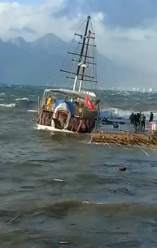 Antalya'da saatteki hızı 60 kilometreyi aşan rüzgar nedeniyle Yat Limanı'ndaki 28 metrelik tekne ile küçük balıkçı teknesi battı. Yat Limanı'nda bağlantı noktasından kurtulan tur teknesi, dalgalar ile denize doğru sürüklendi. Liman ağzında tutulmaya çalışılan tekne, liman görevlileri ve balıkçıların tüm çabasına rağmen hasar aldığı için battı. Teknenin batma anı bir vatandaşın cep telefonu kamerasına yansıdı. Görüntüyü çeken kişinin, 'Ne yaptıysa kurtaramadılar, çok uğraştılar. Her şeyi yaptılar ama olmadı. Ne yaptılarsa olmadı. Bu rezilliğe göz yumanlar, utansın. Gerçekten burada işkence çekiyoruz, teknenin son hali' sözleri duyuldu.