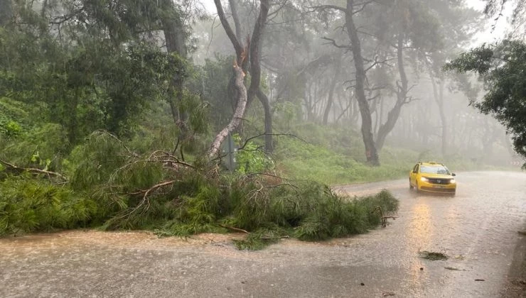 Antalya’nın merkez Aksu ilçesi sınırları içinde bulunan Kurşunlu Şelalesi yolu üzerinde şiddetli yağan yağmura dayanamayan ağaç kırılarak yola devrildi.