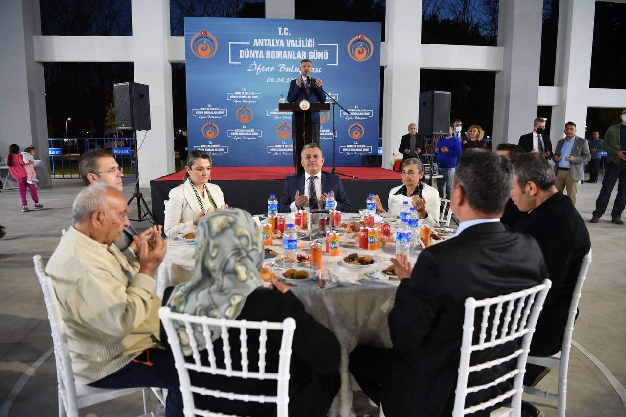 8 Nisan Dünya Romanlar Günü münasebetiyle Antalya Valiliği tarafından Antalya’da yaşayan Romanlar için iftar yemeği düzenlendi. Vali Ersin Yazıcı’nın ev sahipliğinde düzenlenen programa Büyükşehir Belediyesi Genel Sekreteri Cansel Tuncer, Muratpaşa, Kepez, Konyaaltı, Aksu ve Döşemealtı Kaymakamları, İl Emniyet Müdürü Mehmet Murat Ulucan, Aile Ve Sosyal Hizmetler İl Müdürü Abdullah Çalışkan, Antalya Romanlar Derneği Başkanı Fatma Şirin ve çok sayıda vatandaş katıldı.