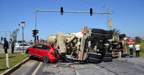 Antalya’nın Manavgat ilçesinde beton mikserinin kırmızı ışıkta bekleyen kamyona ve otomobile çarptıktan sonra yanındaki otomobilin üzerine devrilmesi sonucu meydana gelen zincirleme kazada 1 kişi yaralandı. Beton mikserinin yolda yatay olarak devrilmesi nedeniyle trafiğe kapanan yolda 10 kilometrenin üzerinde araç kuyruğu oluşurken, tur araçlarının yanı sıra bazı araçların refüje çıkıp yoluna devam ettiği gözlendi.