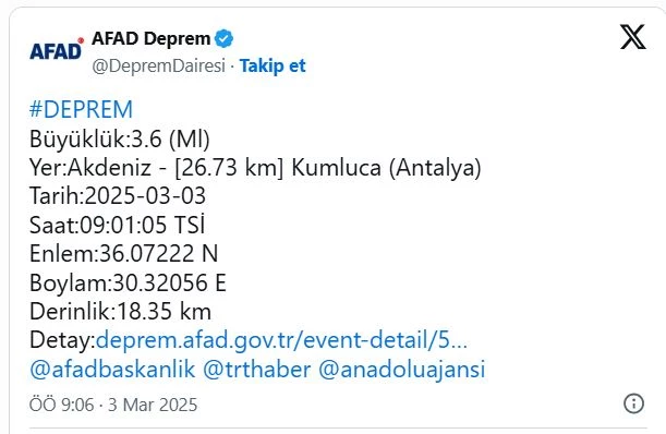 AFAD, Antalya’nın Kumluca İlçesinde 3,6 büyüklüğünde deprem olduğunu duyurdu.