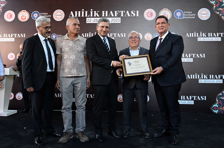 Antalya Esnaf ve Sanatkarlar Odaları Birliği (AESOB) tarafından 38. Ahilik Haftası nedeniyle düzenlenen törene katılan Vali Şahin Yılın Ahisi Üsame Çolak'a Ahi Kaftanı giydirdi.