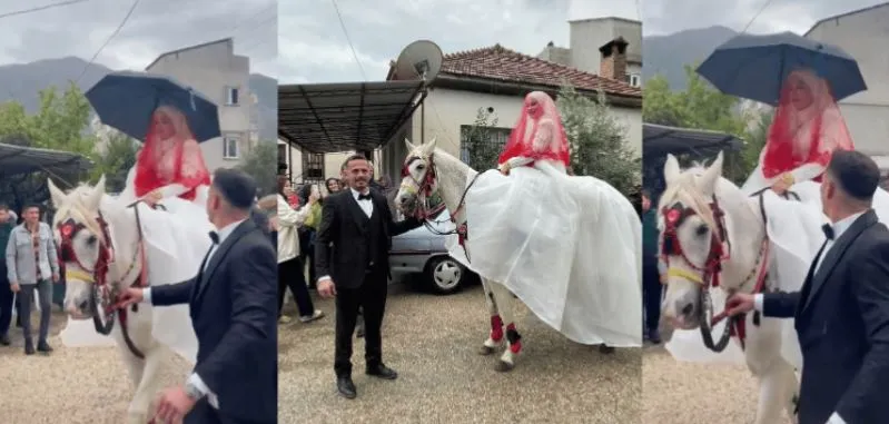 Gelin alma merasimi atla gerçekleştirildi. Ata bindirilen gelin, bu sırada yağışın başlamasıyla şemsiye açarak ilçede tur attı.
