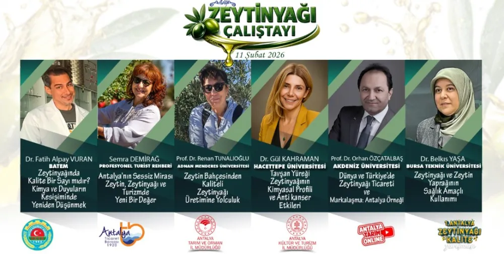 Antalya, Zeytinyağı Çalıştayı’na ev sahipliği yapacak. 11 Şubat 2026’da alanında uzman akademisyenler ve sektör temsilcileri, zeytin ve zeytinyağını konuşmak üzere Antalya’da bir araya gelecek.