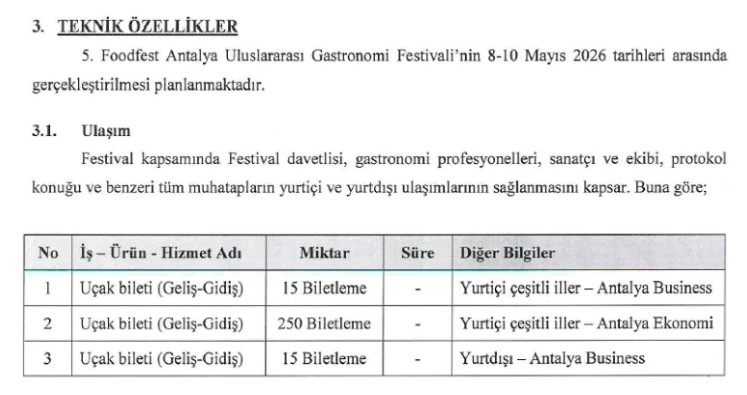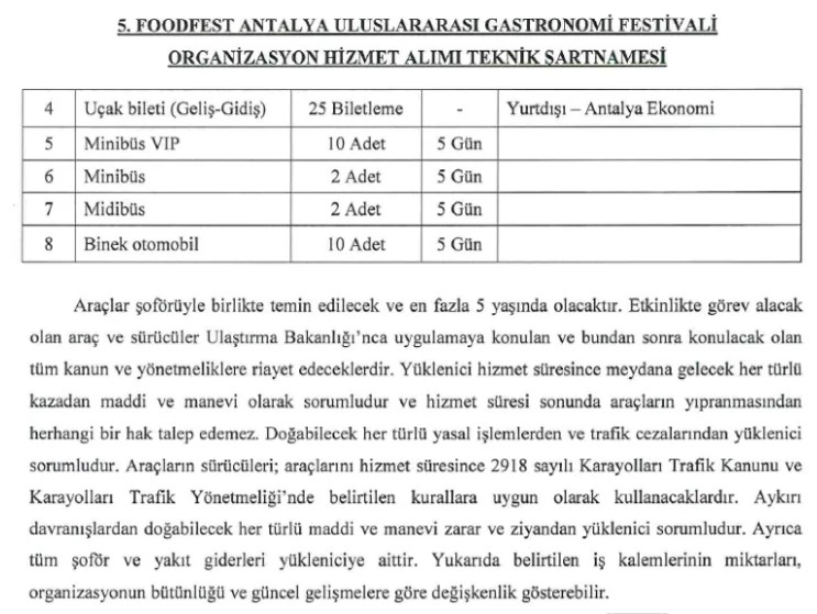 Antalya Büyükşehir Belediyesi’nin bu yıl 5. Kez düzenlemeyi planladığı ‘Foodfest Antalya Uluslararası Gastronomi Festivali için 25 Mart’ta ihale yapılacak. Geçtiğimiz yıl 48 milyon 500 bin TL harcanan festival için bu yıl ne kadar harcama yapılacağı ihale sözleşmesinin imzalanmasıyla ortaya çıkacak. Ancak festivalle ilgili hazırlanan teknik şartnamede yer alan detaylar, 3 gün sürmesi beklenen festivalin belediyeye yüklü bir maliyet getireceğine işaret ediyor. Festival için yurt dışı ve yurt içinden Antalya’ya gidiş dönüş 305 uçak bileti, 4 ve 5 yıldızlı otellerde 350 geceleme, toplam 3 bin kişilik yemek ve kumanya hizmeti ile 10 tanesi VİP olmak üzere 12 adet minibüs, 10 binek otomobil, iki adet de midibüs hizmeti alımı yapılacak.
