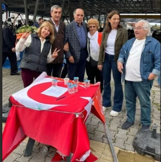 "İstanbul Büyükşehir Belediye Başkanı Ekrem İmamoğlu'nun gözaltına alınmasına tepki olarak Cumhuriyet Halk Partisi Genel Merkezi öncülüğünde imza kampanyası adı altında Kemer Kaymakamlığına vermiş olduğu yazılı dilekçede belirtilen yerlerde stant açma faaliyetleri düzenledik. Fotoğraf stant açma faaliyetleri esnasında çekildi. Masa üzerindeki Türk bayrağını kendim serdim. Bayrak masa üzerinde ve yer ile teması bulunmuyor. Fotoğraf çekerken havanın rüzgarlı olması nedeniyle fotoğraf karesinde Türk bayrağının kırışık gözükmemesi için dört ucundan yere ip ile sabitledik. Çekimden sonra yere sabitlenmiş dört ucun iplerini söktük. Fotoğraf açısından bayrağın uçları yerde sürünüyor gibi görünüyor. Kesinlikle Türk bayrağına hakaret amaçlı bir harekette bulunmadık."