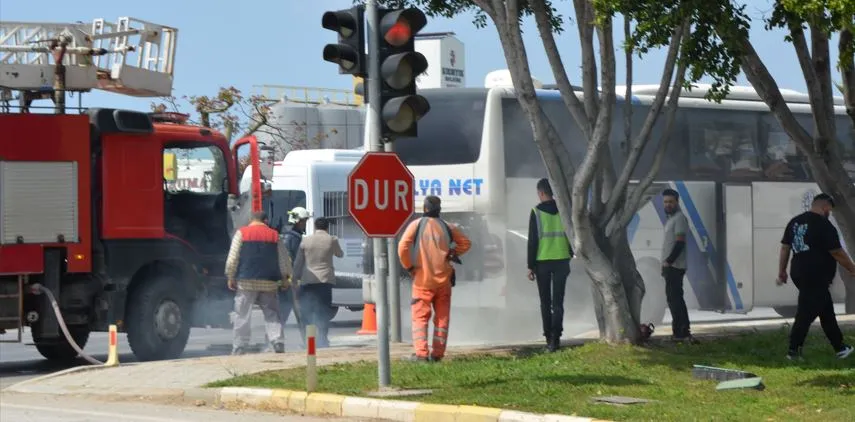 Antalya'nın Serik ilçesinde seyir halindeki şehirler arası yolcu otobüsünde çıkan yangın, yedek şoförün dikkati sayesinde fark edilip söndürüldü.